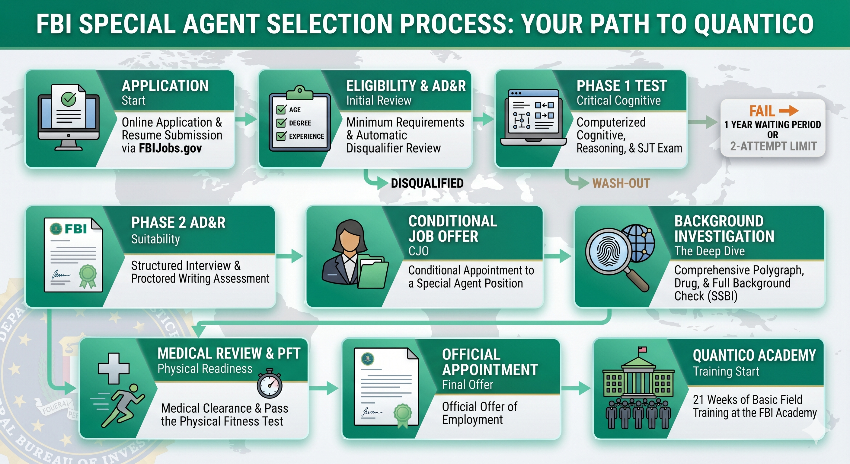 The path to becoming a Special Agent is notoriously difficult, with a high "washout" rate. The Bureau utilizes a phased approach to filter for the most resilient and capable candidates.