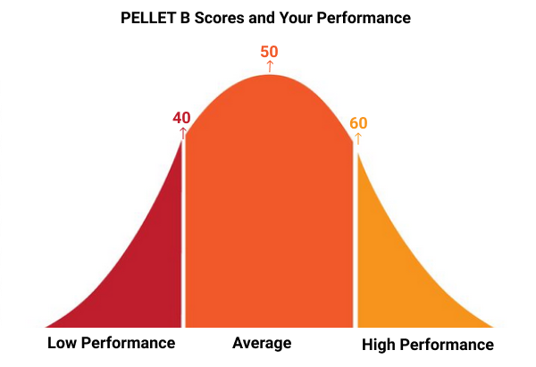 The PELLET B scoring is based on the T-score model. It means that your performance is placed into a distribution (represented below as a bell-shaped curve), where 50 is considered the average score (meaning, no matter what the real average is among test-takers, it is displaced to 50 for convenience).