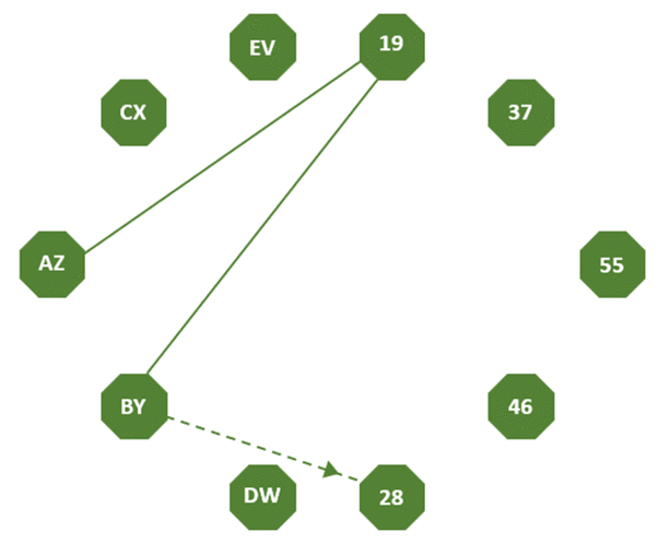 The question asks you to find the logical rules applied between these nodes and complete the sequence, which started with the connected nodes: AZ -> 19 -> BY -> 28.